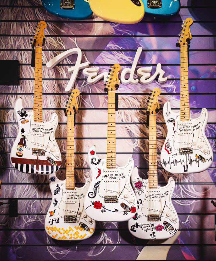 A collection of guitars designed and painted to honour five legendary guitar players.