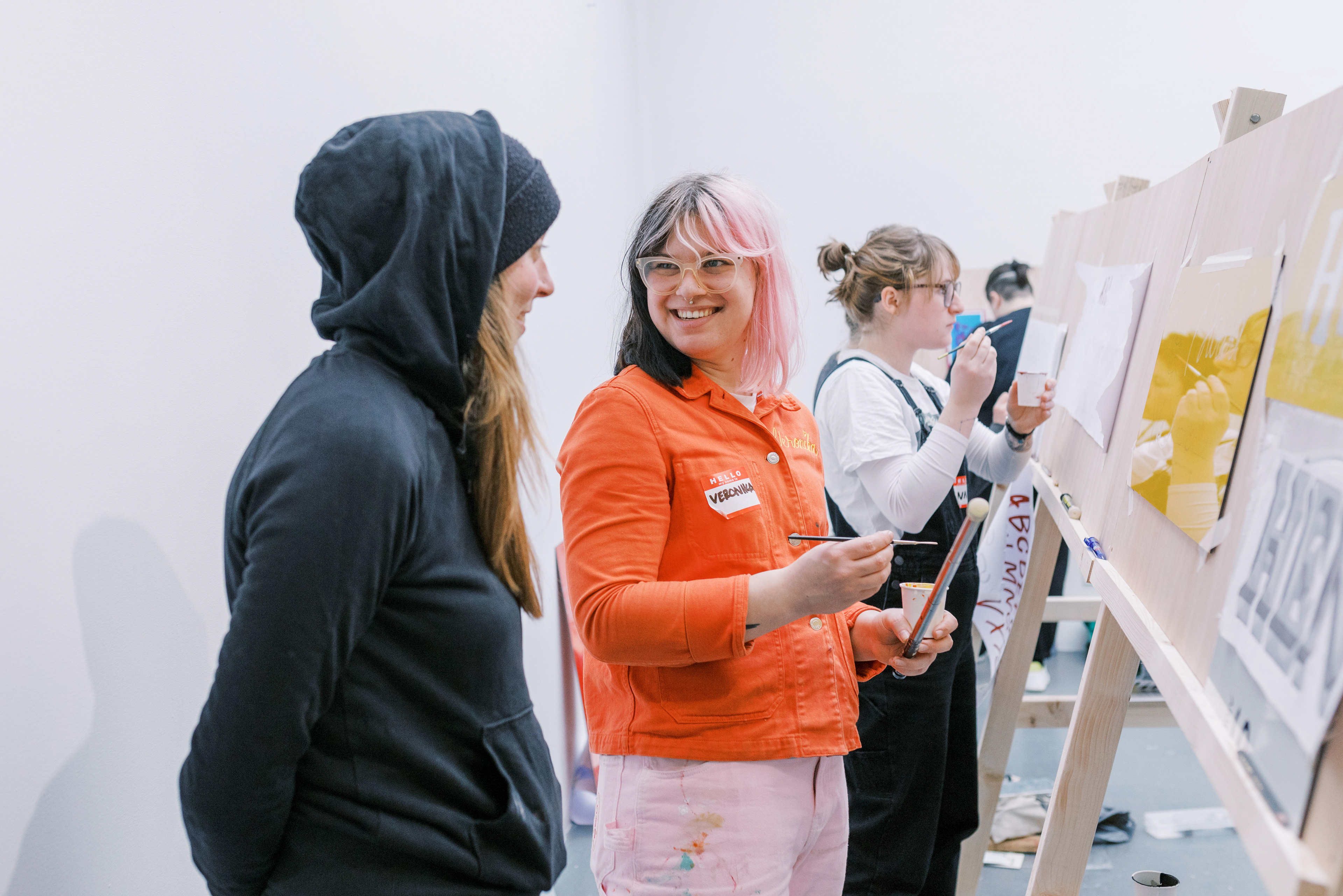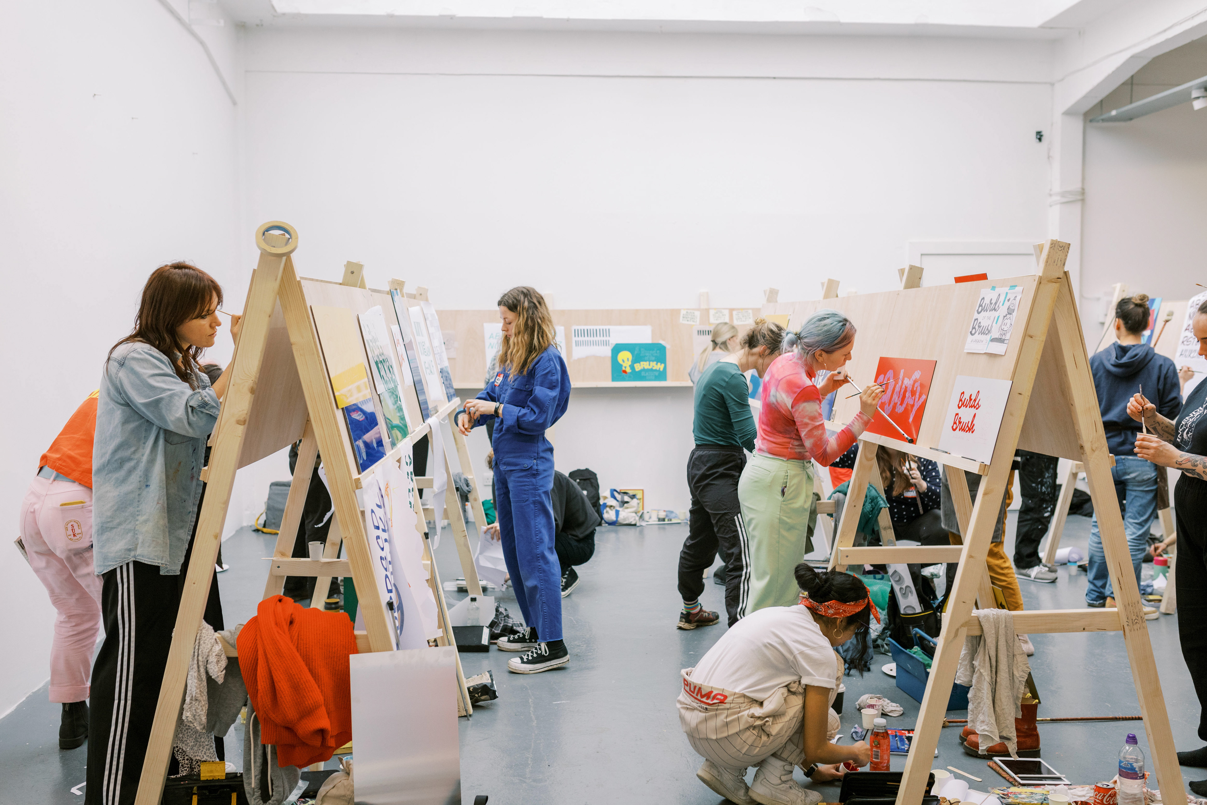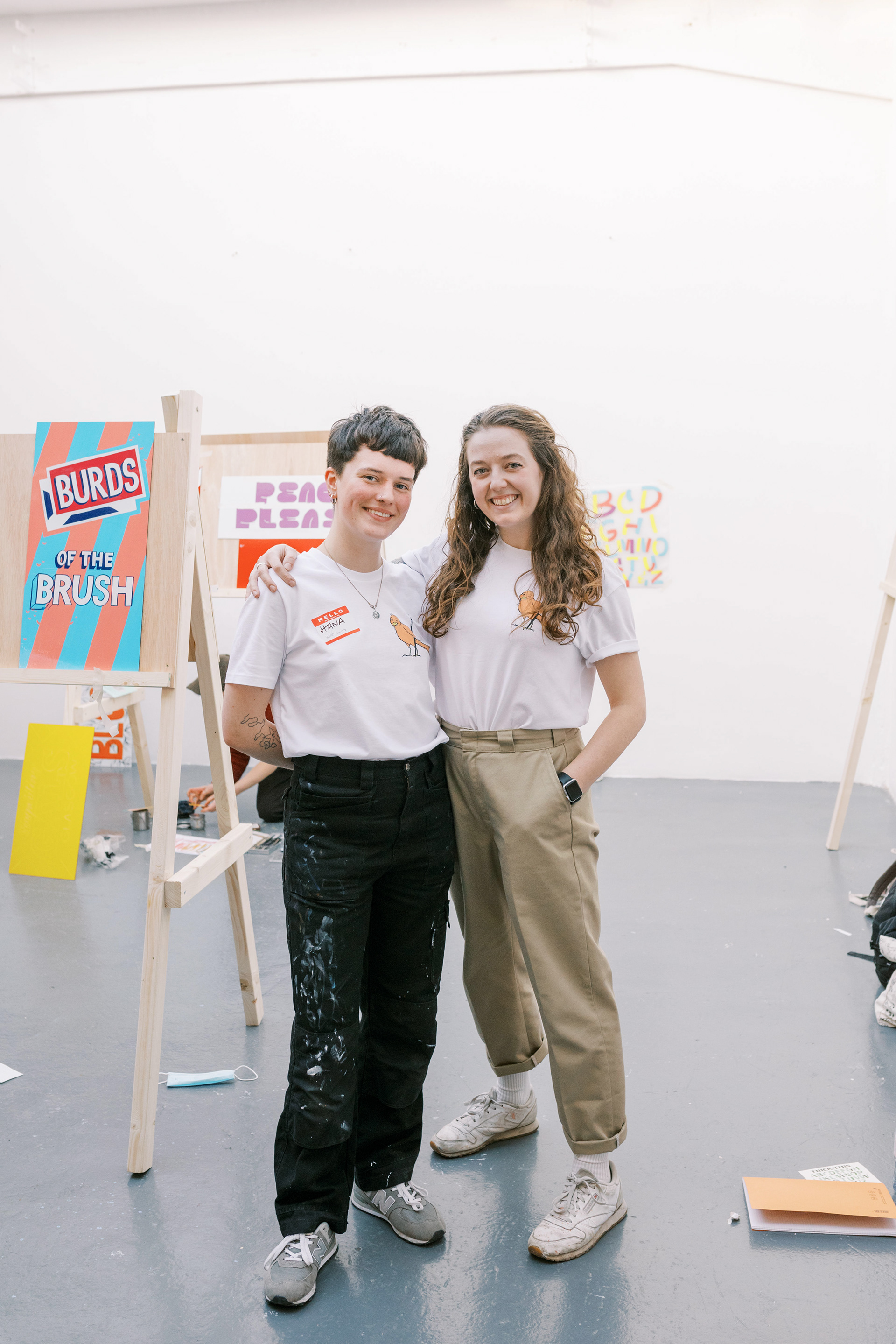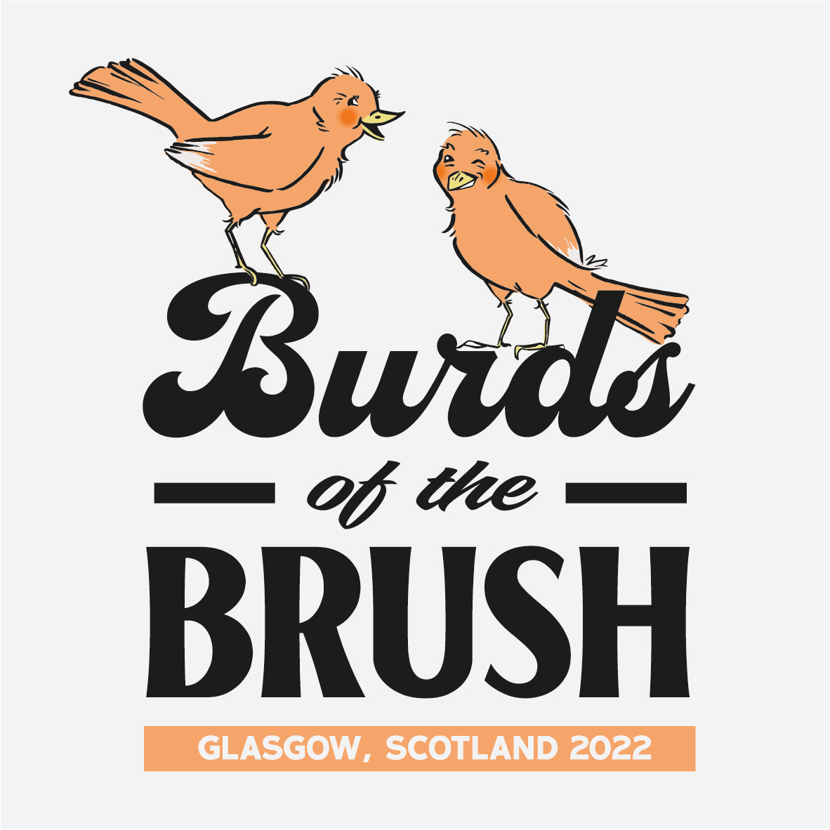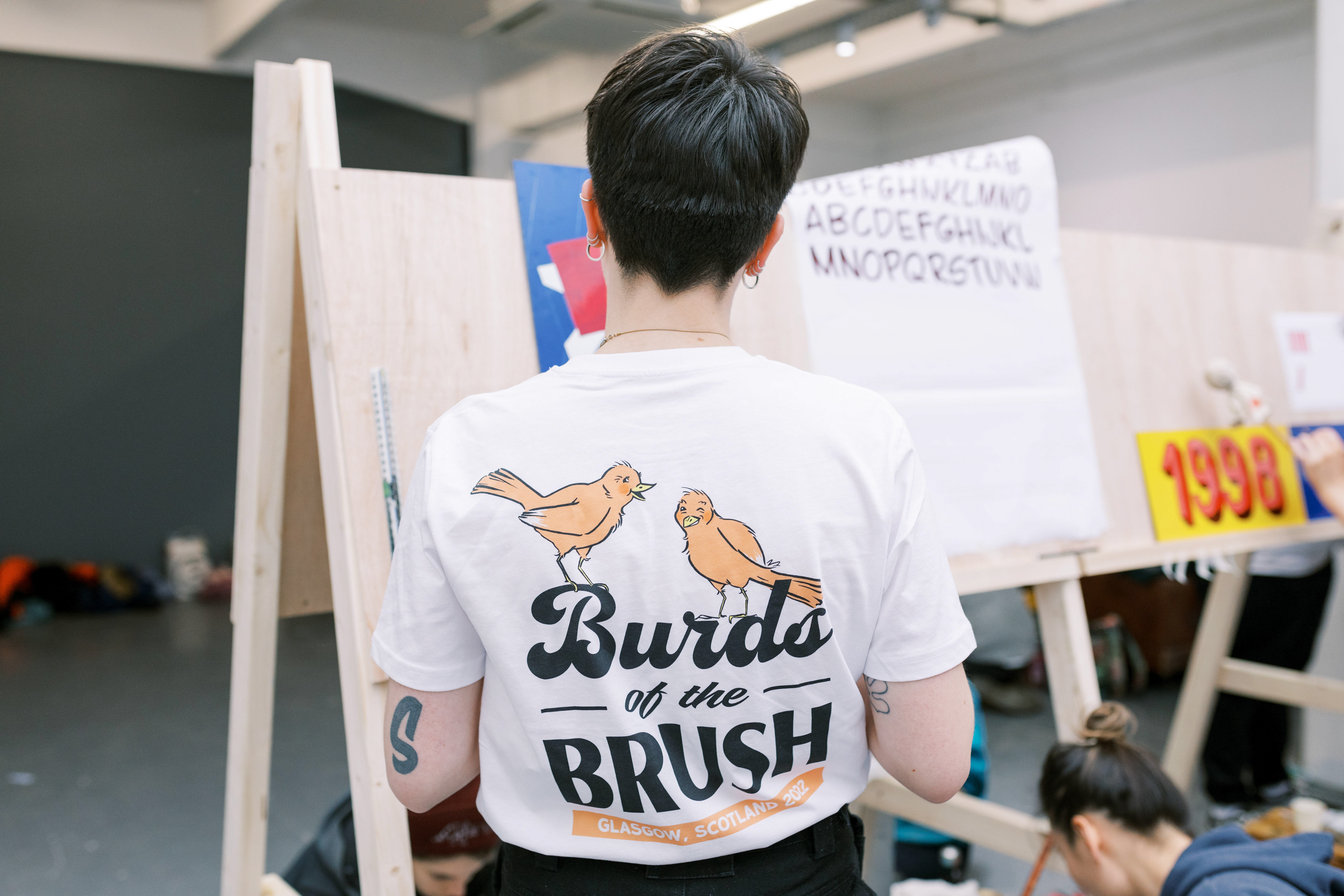 'Burds of the Brush' typography design by Rachel E Millar. 'Burd' illustrations by Hana Sunny Whaler. Event hosting assisted by Hana Lindsay of Sure Signs. Supported by AS Handover, Better Letters/BLAG and Dickies Workwear. Venue provided by SWG3 Glasgow.