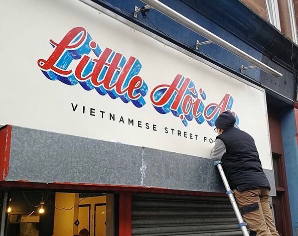Shop front designed and hand painted for Little Hoi An, a Vietnamese street food kitchen in the south side of Glasgow. I took inspiration from old shop fronts around Vietnam to create a distressed cursive style for the fascia.