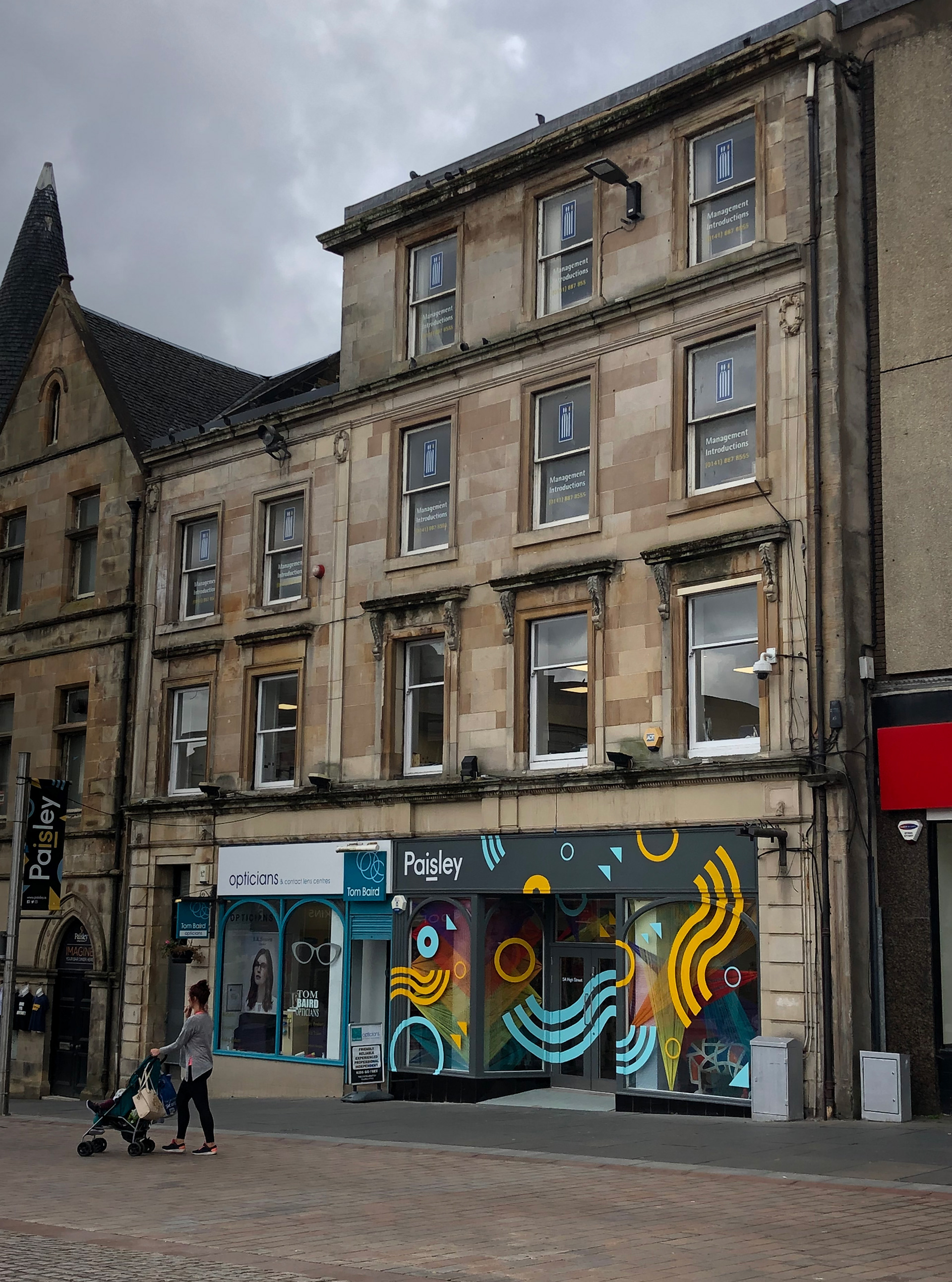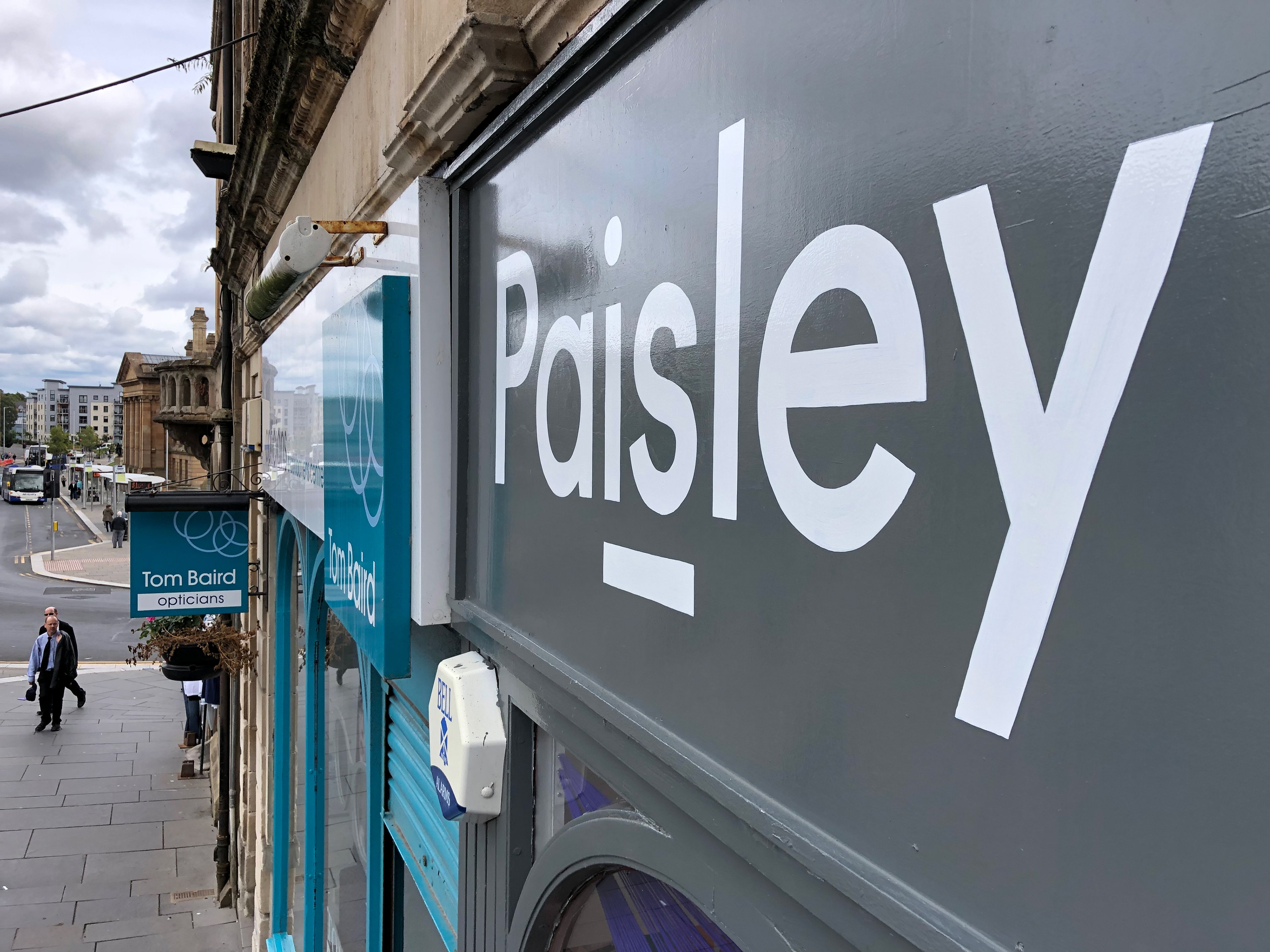 Painted shop front for Paisley is on the High Street – the new campaign for tourism in Paisley. Branding by
