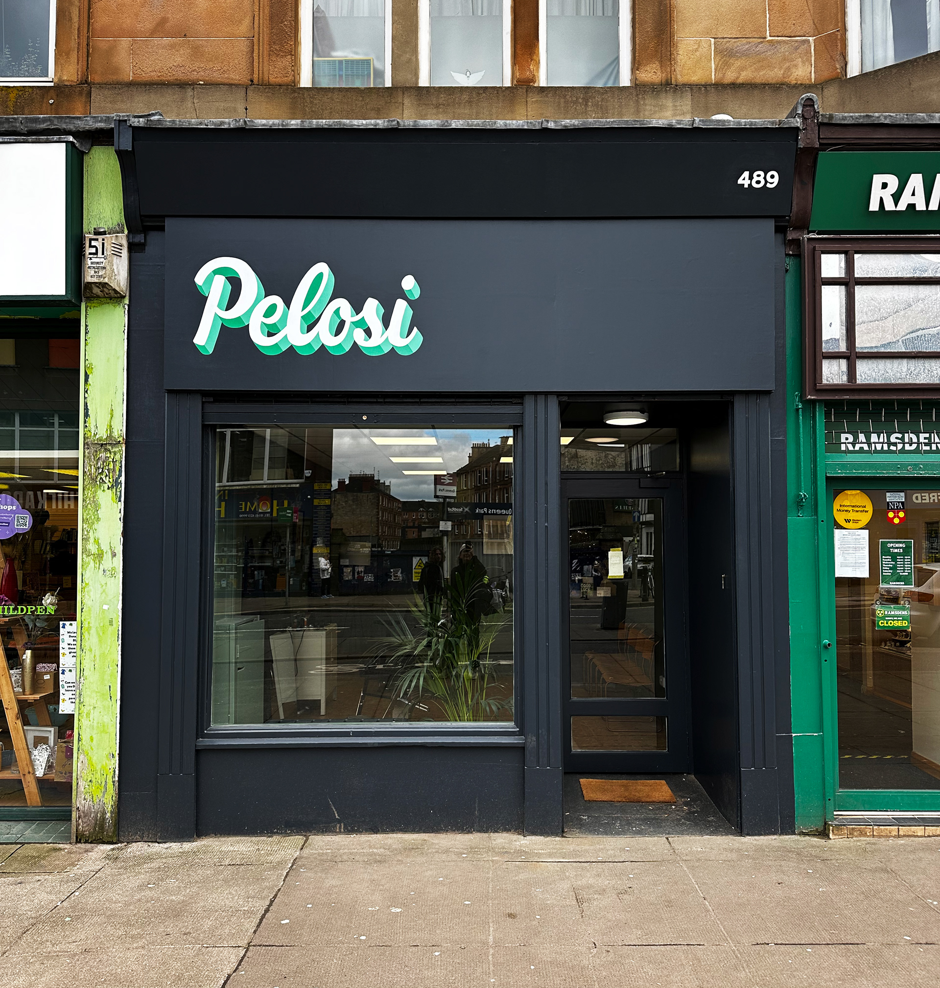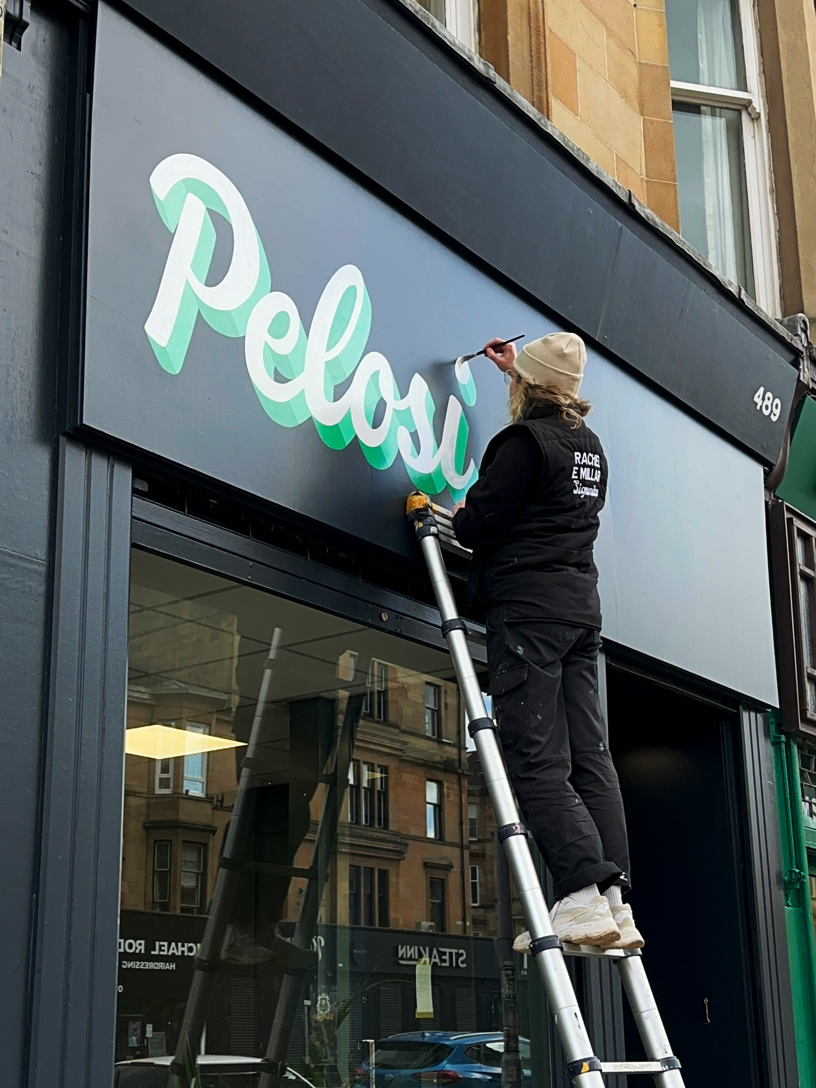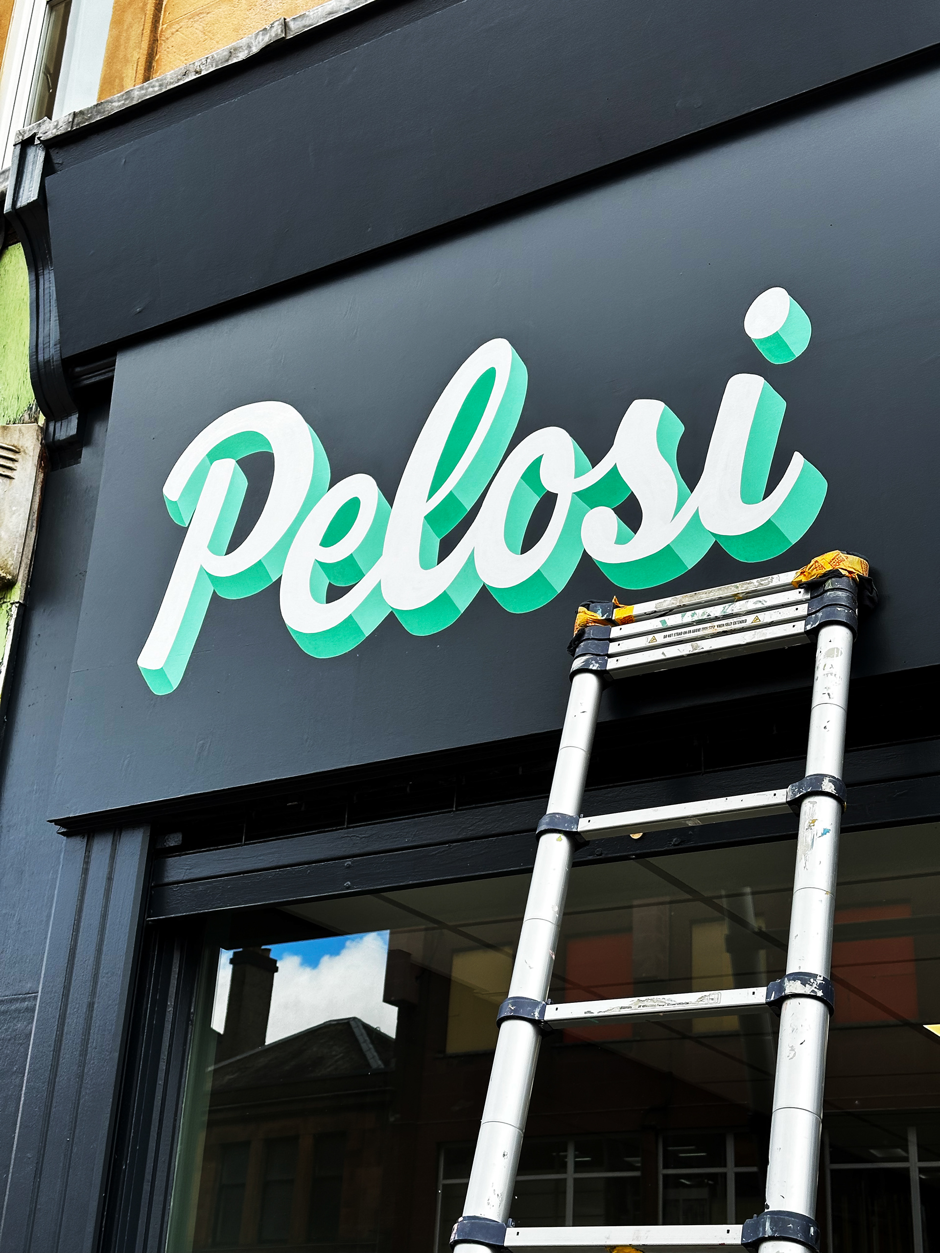 Logo and signage hand drawn and signwritten for Pelosi Barbershop in Glasgow southside. Design inspired by an old ice cream sign and adapted to compliment the interior colour palette of the shop.