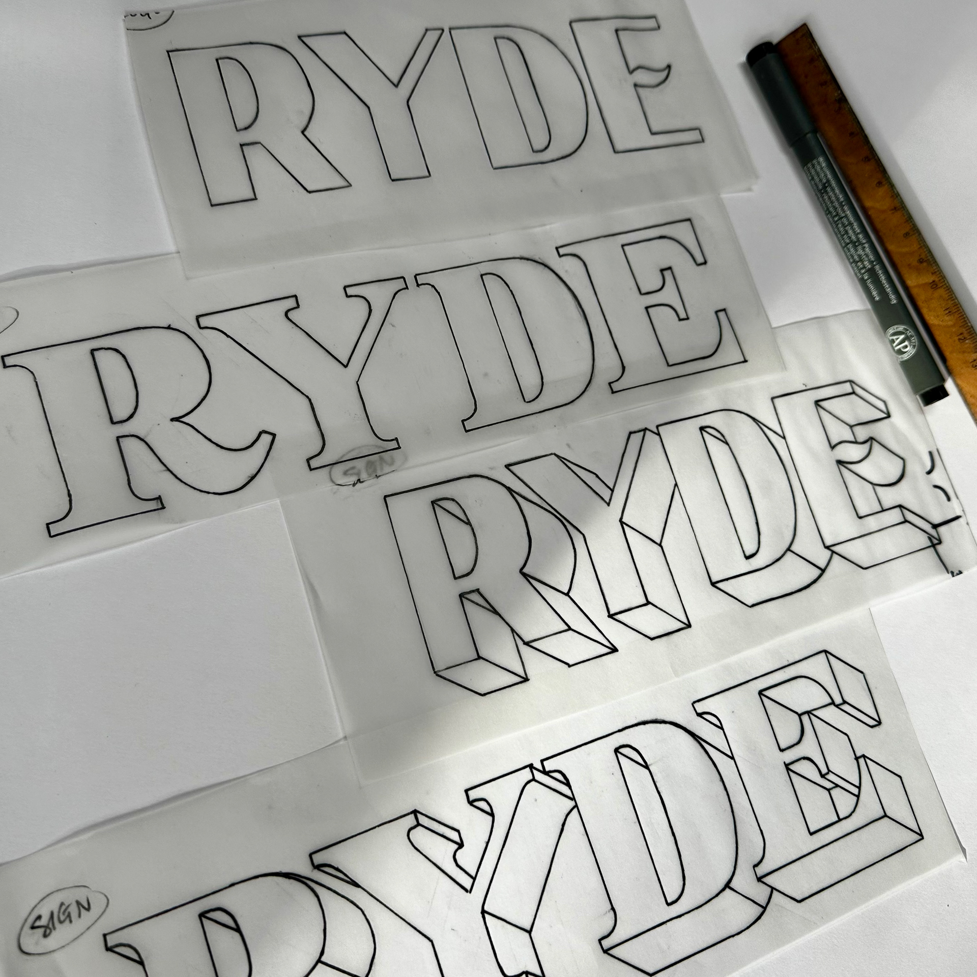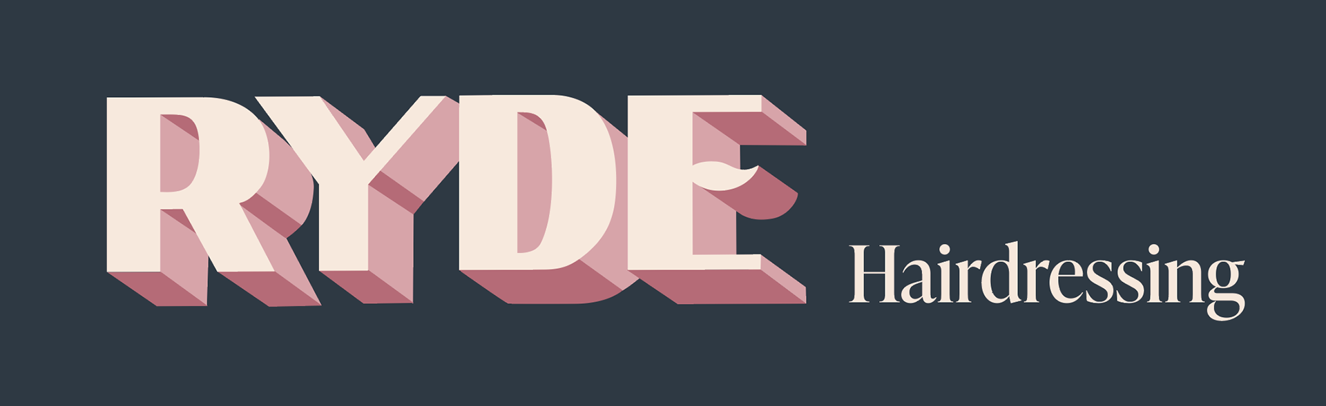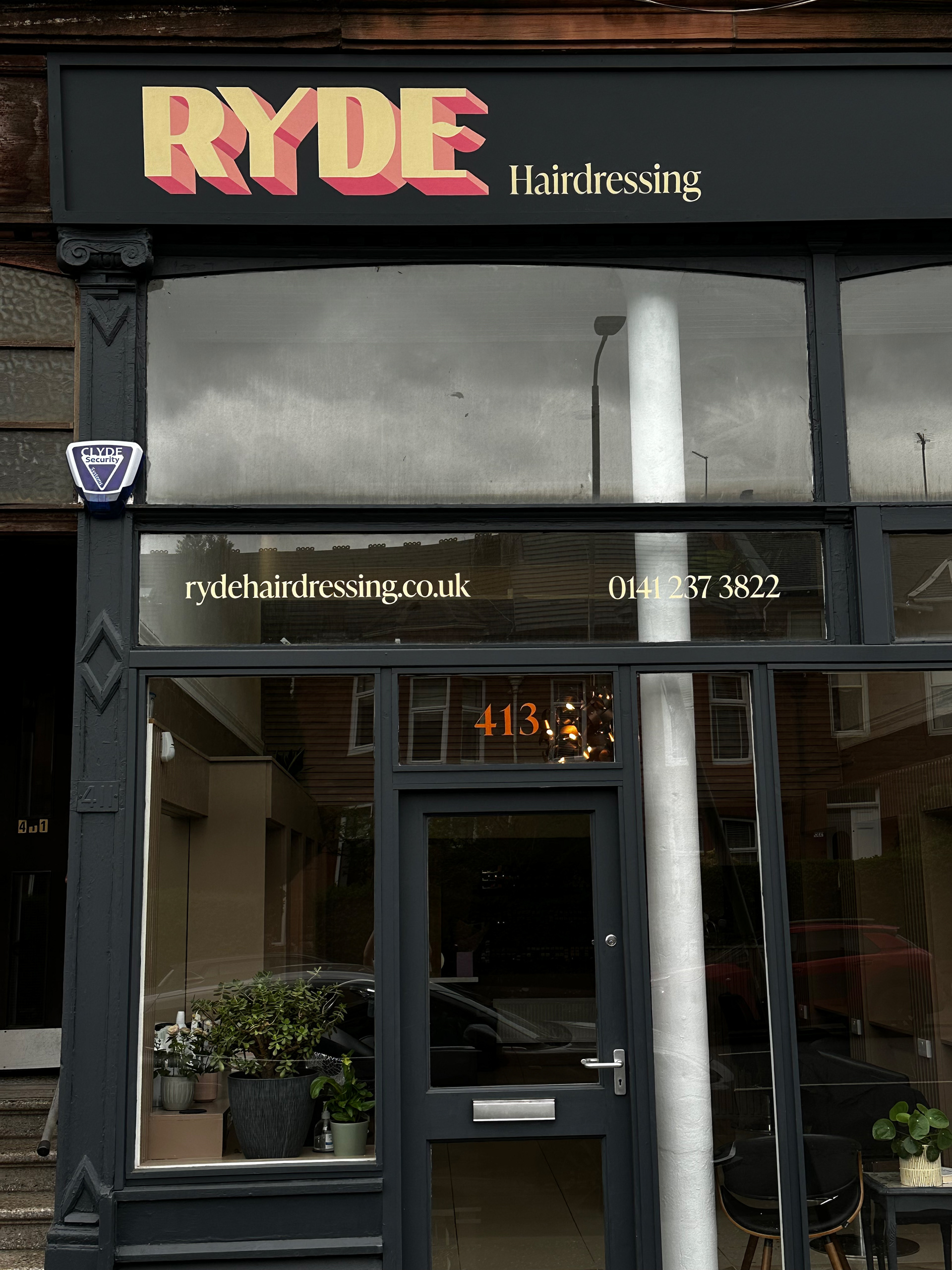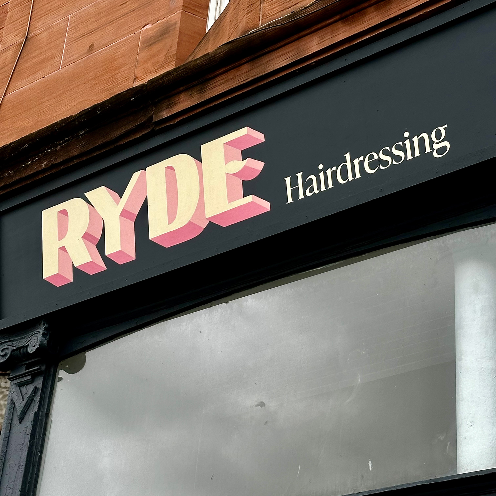 Signage and logo designed and painted for Ryde Hairdressing in Glasgow's southside. Main logotype sketched by hand, secondary lettering chosen to compliment the hand lettering.