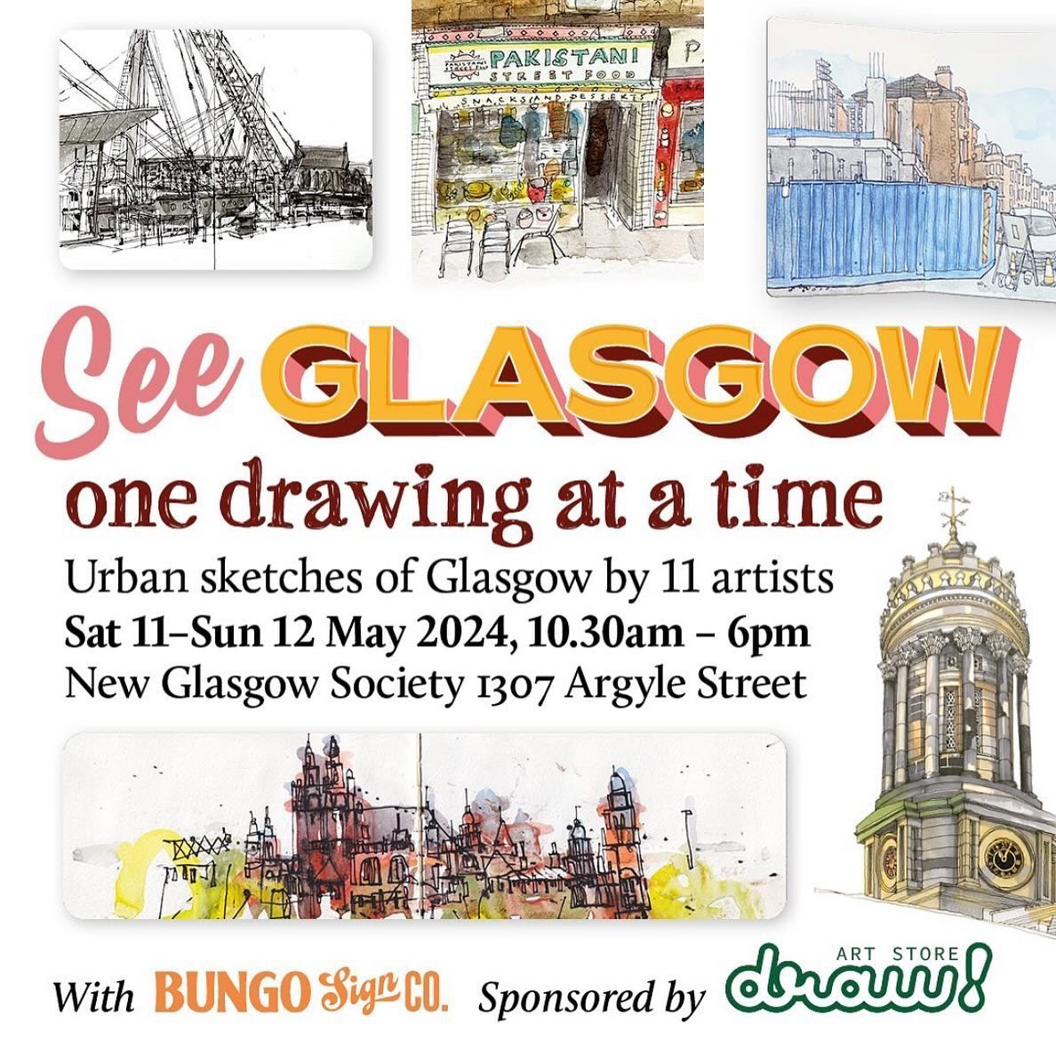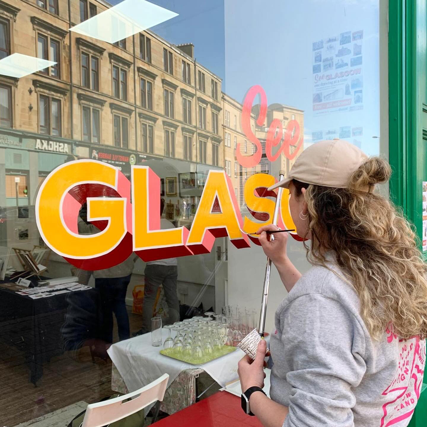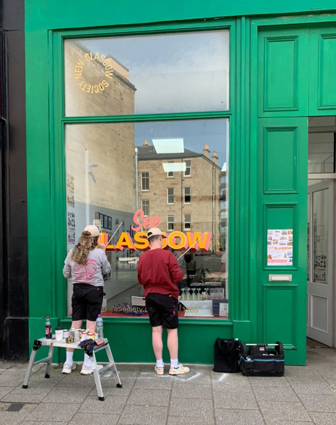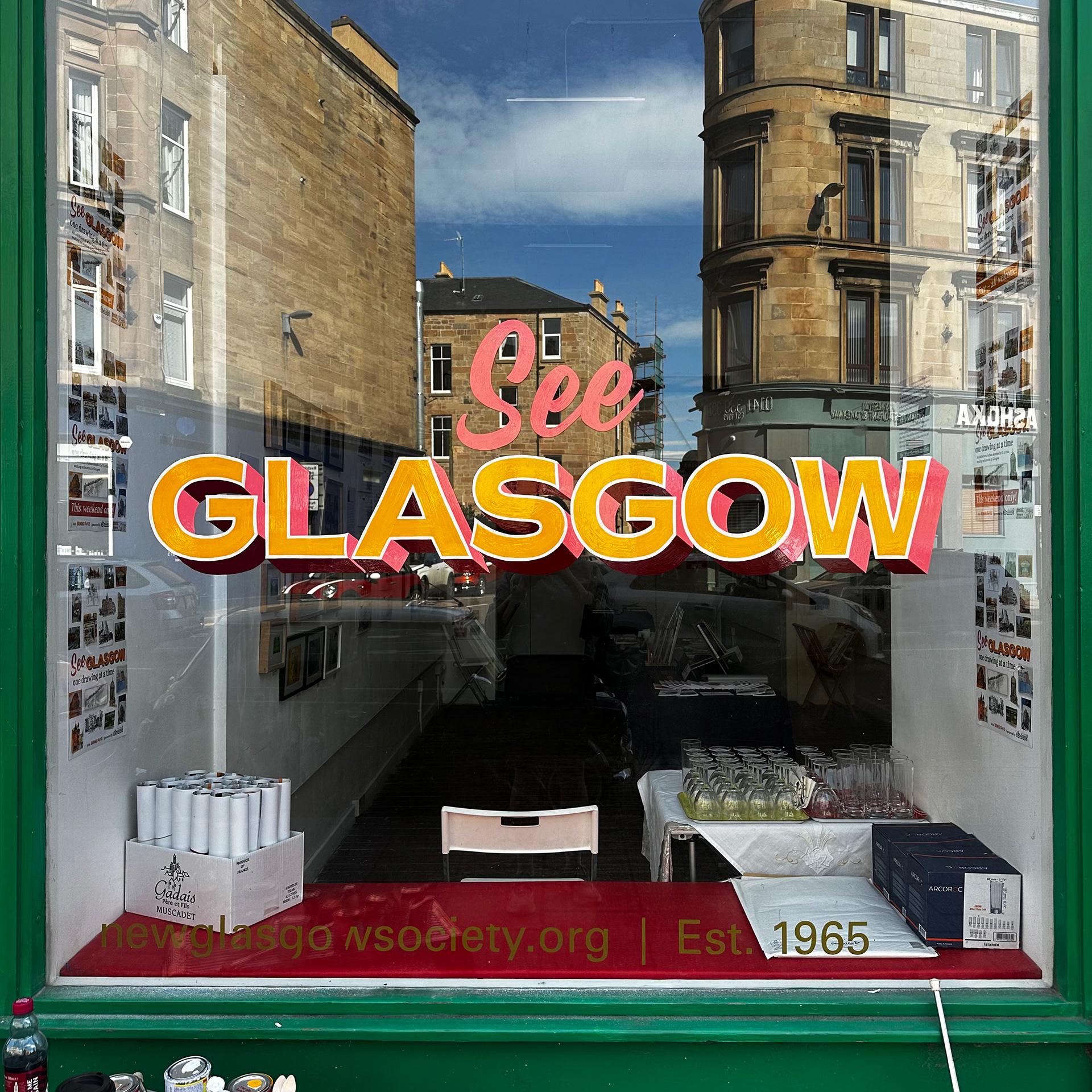 A collaboration with illustrator and curator Liz Reid for 'See Glasgow', an exhibition of 11 urban sketchers 'work at New Glasgow Society in May 2024. Exhibition title designed and window painted by Rachel E Millar.