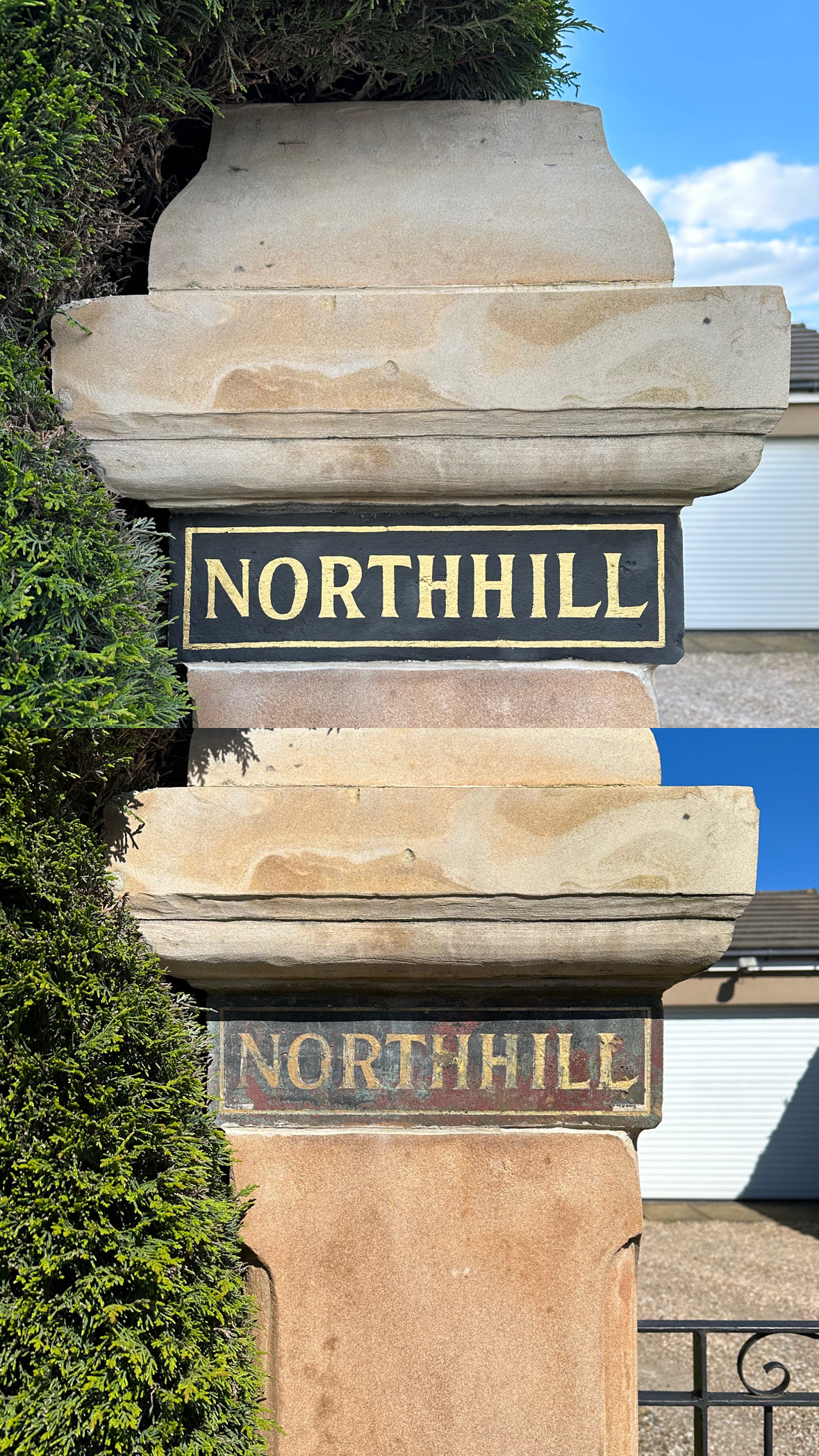 House names and numbers gilded with 23.5 karat gold onto sandstone pillars with black or marroon/red backgrounds. Available in traditional serif Victorian style in serif or sans serif. These can be gilded onto plain sandstone or I can restore older signs. I can also gild carved numbers.